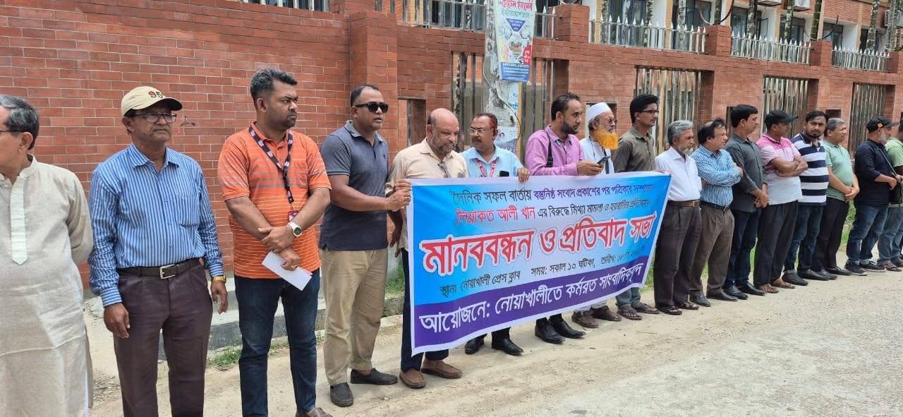 নোয়াখালীতে দৈনিক সফল বার্তা পত্রিকার প্রকাশ ও সম্পাদক অধ্যাপক লিয়াকত আলী খানের বিরুদ্ধে সংবাদ প্রকাশের জেরে মিথ্যা ও বানোয়াট চাঁদাবাজির মামলা দায়ের করায় আগামী ১০ দিনের মধ্যে মিথ্যা মামলা প্রত্যাহার এবং পত্রিকার অফিস খুলে দেওয়ার দাবিতে জেলা বিএনপির সদস্য ও দখলবাজ আবদুল মোতালেব আপেলের বিরুদ্ধে মানববন্ধন ও প্রতিবাদ সভা করেছেন সাংবাদিকরা।