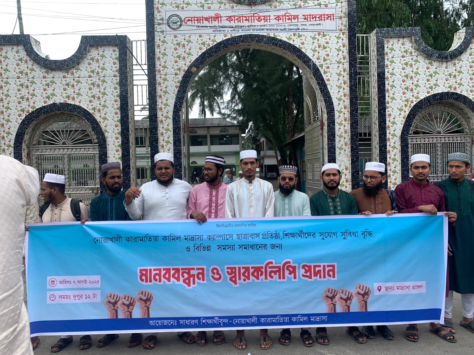 মোঃ নুর হোসাইন : নোয়াখালীর ঐতিহ্যবাহী প্রাচীন ধর্মীয় উচ্চ-শিক্ষা প্রতিষ্ঠান নোয়াখালী কারামতিয়া কামিল মাদ্রাসায় ছাত্রাবাস প্রতিষ্ঠা সহ বিভিন্ন দাবিতে মানববন্ধন
